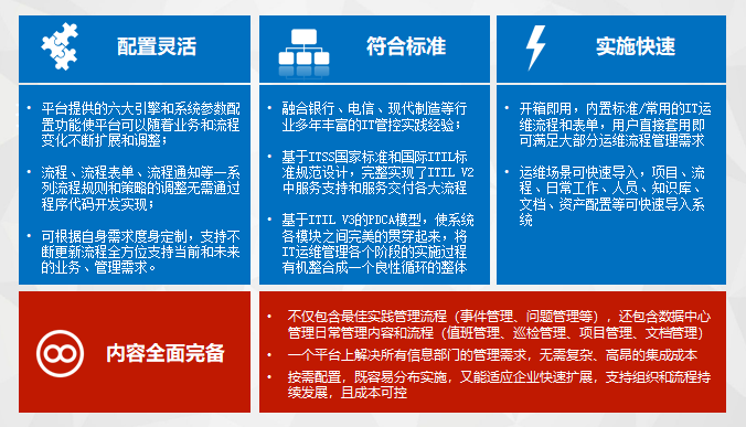 所以,靈活的配置管理和驗證功能是我們所關注的第二個功能。靈活的配置管理和驗證功能可以提供多種資產配置數據的錄入和導入功能,并同步其他管理流程對資產配置庫的改動數據,實現(xiàn)配置管理數據的整個生命周期的管理。同時,模板化的定義能力,具備聯(lián)動底層監(jiān)控系統(tǒng)實現(xiàn)資源同步和檢查機制,可以發(fā)現(xiàn)和防止配置的隨意修改。