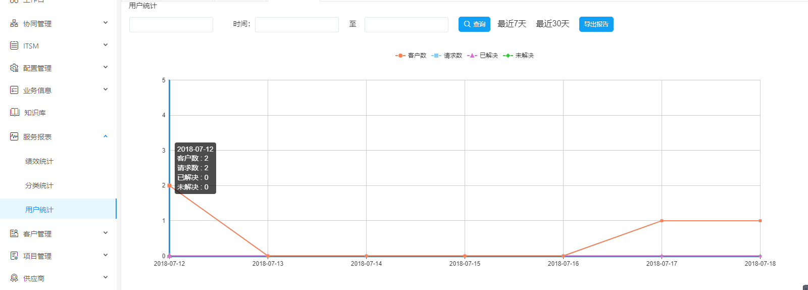 用戶統計主要統計用戶數與上報問題的數量,依舊問題的解決情況,包括已解決和未解決。并通過折線圖顯示,使數據能夠清晰展現。