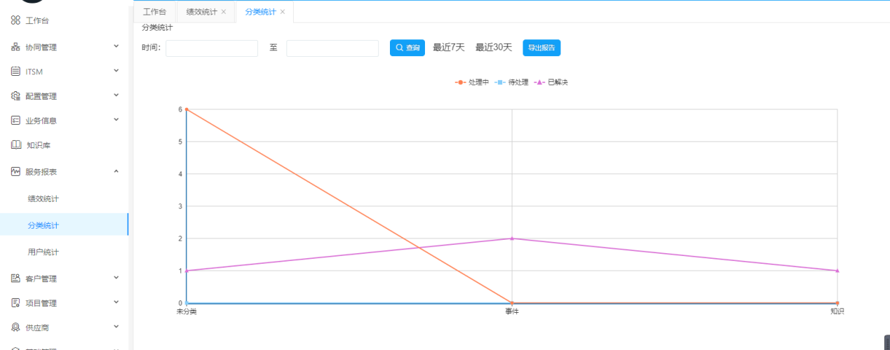 分類統計主要是統計所有工程師處理的工單中,事件和知識工單的情況。并通過折線圖顯示,使數據能夠清晰展現。同時,對于大面積問題的預警也起到了提示作用。根據折線圖,我們可以看到大部分的問題是什么類型的事件,可以生成問題流程,并通過問題流程來從源頭上解決此事件。
