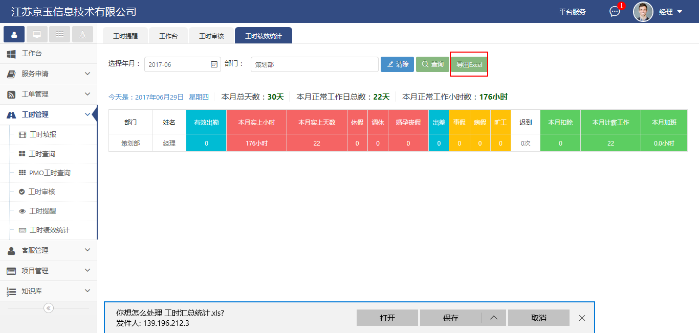 經理審批通過后的工時會進入工時統計報表,作為員工出勤、估算人力時間成本、工資發放的依據。它會根據公司運營時間、休假、出差等計算有效出勤,直接與績效掛鉤。一目了然,并且支持導出表格文件。