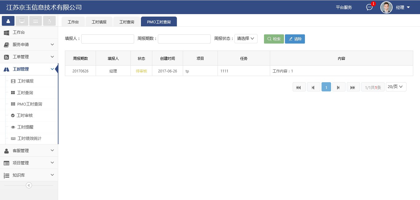 系統為提供比部門經理和項目經理更全的工時數據查詢專門開辟了一個菜單:PMO工時查詢。這個菜單不限用戶角色,可以查看所有填報的工時。