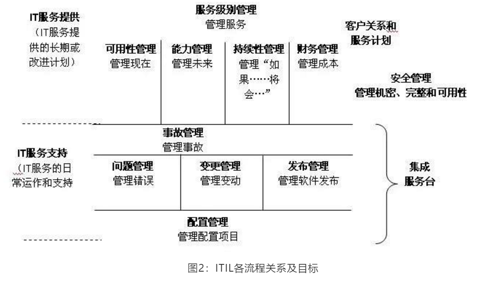從國內(nèi)外應(yīng)用ITIL的成功案例來看,絕大部分企業(yè)只是應(yīng)用了其中部門模塊。不同的企業(yè)、不同的企業(yè)發(fā)展階段,可能會有不同的需求,因此實(shí)施IT服務(wù)管理項(xiàng)目需要能夠做到總體規(guī)劃、分步實(shí)施,部分企業(yè)可以采取“小步快跑”的策略。ITIL對應(yīng)的流程之間的關(guān)系以及流程作用如下圖所示,不同的企業(yè)可以根據(jù)具體情況進(jìn)行甄選。