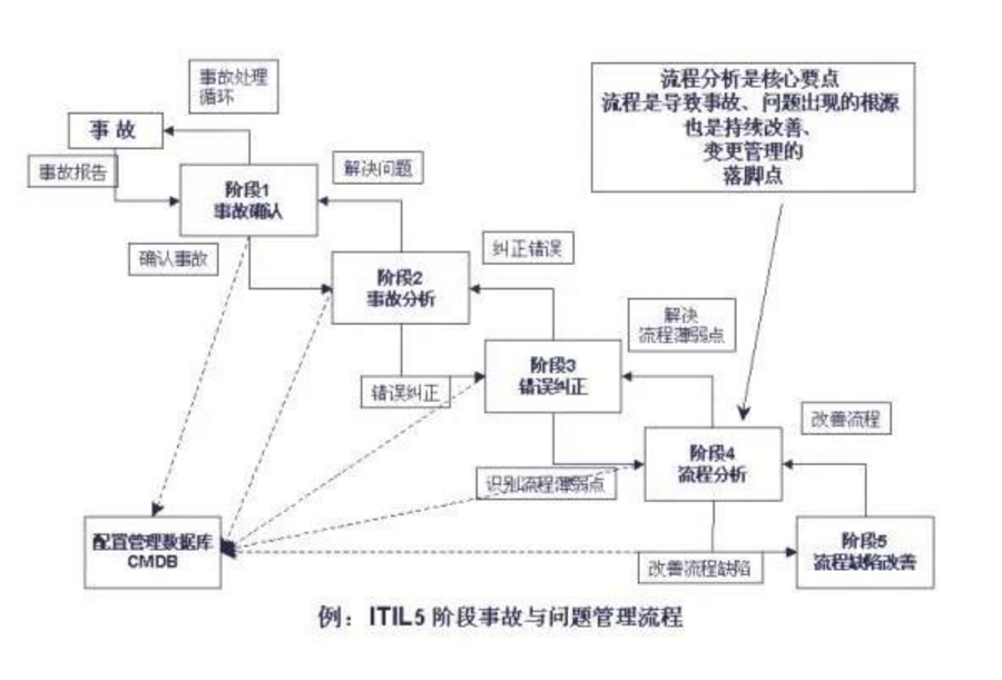 并且,企業(yè)在具體實(shí)施某個功能模塊時,會采用一些階段實(shí)施方法論,如下圖所示的ITIL 5階段事故和問題管理流程。